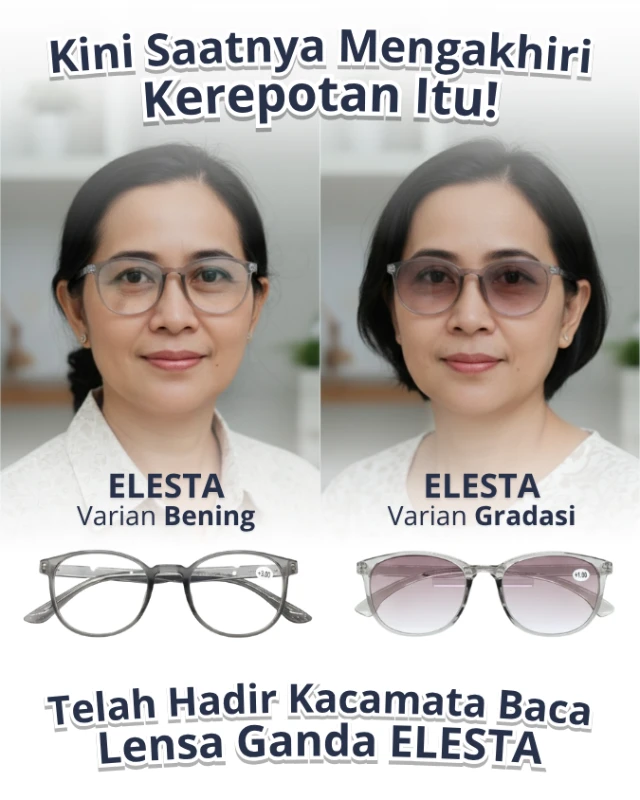 Memperkenalkan ELESTA, kacamata baca lensa ganda yang revolusioner. Membaca Al-Qur'an, melihat resep di dapur, hingga menonton acara TV favorit kini jadi lebih mudah dan nyaman.