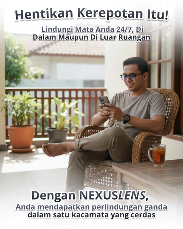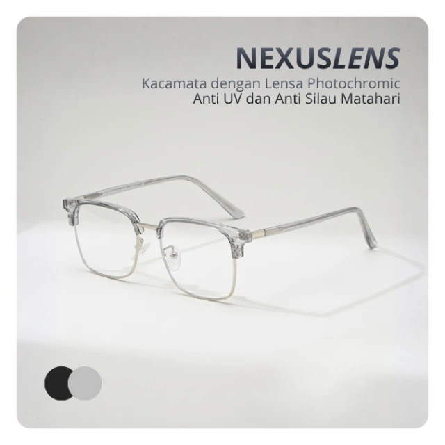 Memperkenalkan NEXUSLENS solusi cerdas untuk mata Anda: Lensa Photochromic dengan bingkai half-frame premium yang ringan.